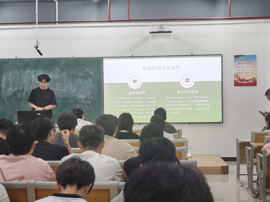 活动以互动分享与知识学习相结合的形式展开。在交流探讨环节,同学们围绕 “如何给予朋辈有效支持” 展开热烈讨论。面对 “室友考试失利”“同学课堂回答紧张出错” 等情境,大家结合自身经历,分享陪伴倾听、鼓励开导等暖心做法,深入探讨有效给予朋辈支持的意义与实践。随后,各班通过案例分析,解码陪伴姿态、情绪镜像反应和积极倾听的作用,引导同学们理解支持他人的正确方式。