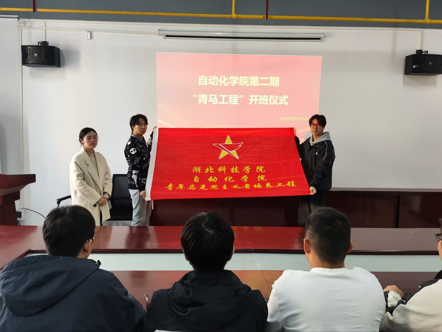 随后,院团委书记李美莹老师郑重地将青马精神的旗帜交到第二期青马学员代表手中,并发表了热情洋溢的讲话。她对第二期青马班的成立表示热烈祝贺,并鼓励学员们要勇于担当、敢于创新,努力成为社会主义核心价值观的坚定信仰者、积极传播者和忠实践行者。李美莹老师强调,青马学员要继承和发扬党的优良传统,不断提升自己的政治素养和理论水平,为实现中华民族伟大复兴的中国梦贡献青春力量。随后,李老师详细解读了青马工程的相关培训方案,明确了培训目标、课程安排和实践要求。她要求学员们要珍惜学习机会,积极参与培训活动,严格按照培养方案展开学习,努力成长为新时代青年马克思主义者,为中国特色社会主义事业贡献自己的力量。