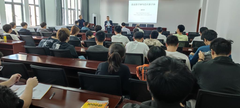 顾思洪研究员报告题目为“微波原子钟与芯片原子钟”。报告介绍了世界时间的定义与产生,氢钟、铯束钟、谱灯抽运气泡型铷钟等微波原子钟的工作机制、性能特点以及应用领域。随后,顾思洪研究员介绍了相干布居囚禁原子钟、芯片原子钟的工作原理、特点优势,就中科院武汉精密测量院CPT研究组在芯片原子钟方面开展的研究和与会师生们进行了交流。他表示,芯片原子钟以其体积小、功耗低、便携性强等特点,正在成为原子钟领域的一个研究热点。
